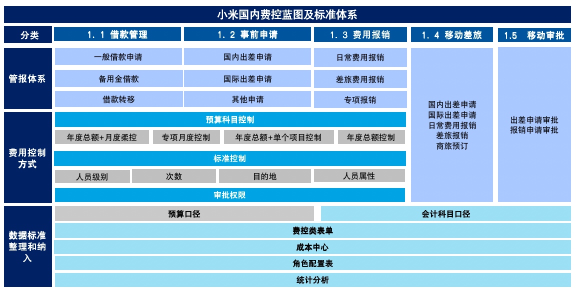 針對小米因缺乏費控數(shù)字化解決方案,而無法打破的多重業(yè)務(wù)發(fā)展阻礙,藍凌為小米實現(xiàn)了在統(tǒng)一的平臺上支撐業(yè)務(wù)運行,從費用管控方式、管控標準、借款報銷差旅等管控功能、數(shù)據(jù)整理分析等方面,搭建了小米國內(nèi)智慧數(shù)字化費控體系,滿足多角色用戶在流程中處理的協(xié)作關(guān)系。同時保障了管理的一致性、業(yè)務(wù)差異性與合規(guī)性、數(shù)據(jù)安全性的原則。