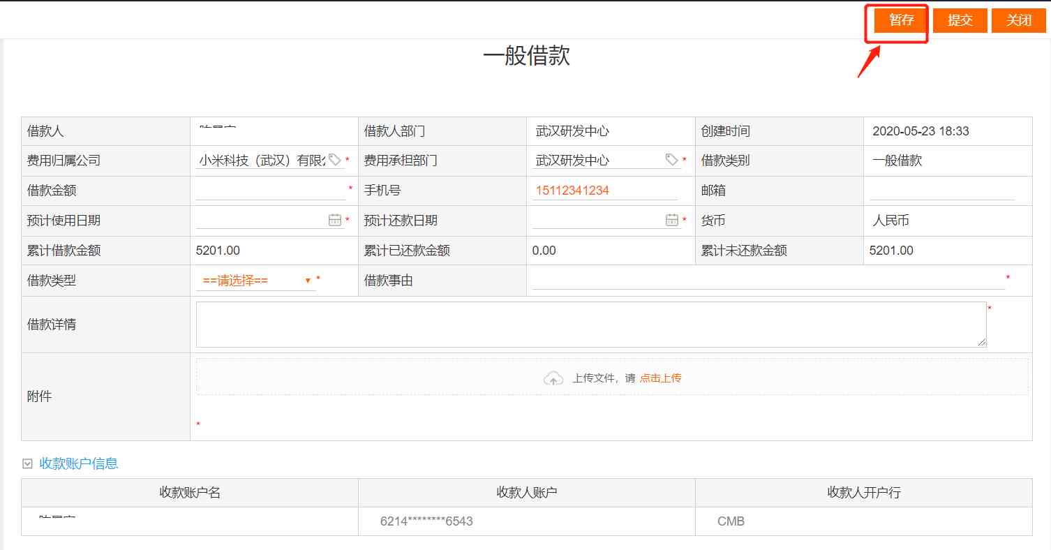 借款管理主要包含個人借款、個人還款和備用金轉(zhuǎn)移三大功能模塊。進入到一般借款還款新建頁面,會自動帶出當前借/還款人、借/還款人部門、創(chuàng)建時間、費用歸屬公司、費用歸屬部門、手機號、累計借款金額、累計已還款金額、累計未還金額、收款賬戶等信息數(shù)據(jù)。申請人填寫其它的必填項,然后提交申請即可進入審批流程。