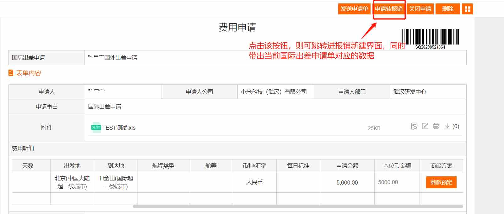 支持在線發(fā)起國內(nèi)出差、國際出差、通用費用、米家活動、市場活動等事前申請。系統(tǒng)自動帶入申請人、申請人部門信息,申請事由、費用明細、日期、附件等一站式填寫登記,提交審批。出差申請審批流程結(jié)束后,申請人可通過“商旅預(yù)定”按鈕,單點登陸攜程商旅平臺,進行機票、火車票、酒店的預(yù)定。同時,事前申請可快捷關(guān)聯(lián)轉(zhuǎn)報銷。操作流暢省心,員工體驗感好,執(zhí)行效率高。