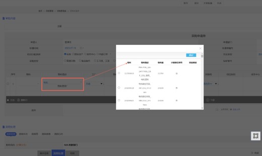 step1:發(fā)起申請時,可選擇要采購的物料,系統(tǒng)自動帶出相關(guān)信息