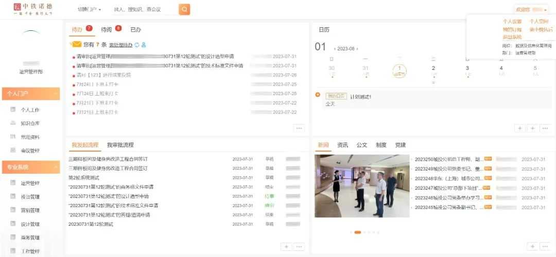 統(tǒng)一門(mén)戶(hù)聚合關(guān)鍵信息與流程,方便用戶(hù)集中、快速處理工作,實(shí)現(xiàn)統(tǒng)一協(xié)同辦公,讓組織更高效。門(mén)戶(hù)首頁(yè)界面布局更清晰簡(jiǎn)潔,只保留4大模塊:待辦待閱模塊,讓重點(diǎn)事項(xiàng)一目了然;個(gè)人日歷模塊,及時(shí)提醒會(huì)議安排和領(lǐng)導(dǎo)交辦工作;流程管理模塊,通過(guò)快捷入口進(jìn)行流程發(fā)起、審批、查詢(xún),直觀清晰呈現(xiàn)流程狀態(tài);分設(shè)新聞、資訊、制度、公文和黨建模塊,區(qū)分新聞動(dòng)態(tài)和行業(yè)資訊,城投制度和上級(jí)制度。