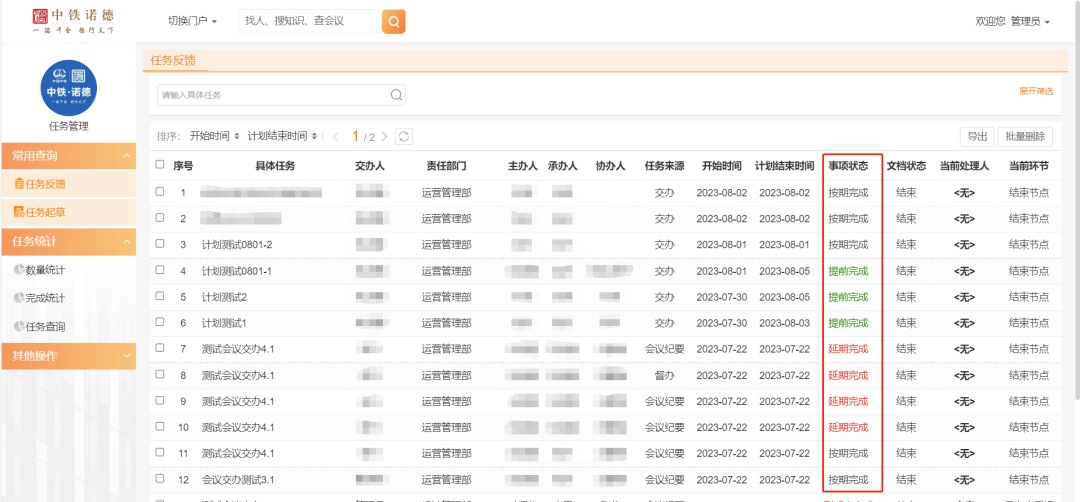 任務(wù)看板:將多類(lèi)工作問(wèn)題描述、責(zé)任人、解決方法等可視化管理,促進(jìn)跨部門(mén)、多層級(jí)高效協(xié)同。任務(wù)完成后反饋成果,月度進(jìn)行交辦數(shù)量及完成情況統(tǒng)計(jì),過(guò)程高度可控,進(jìn)度一目了然。