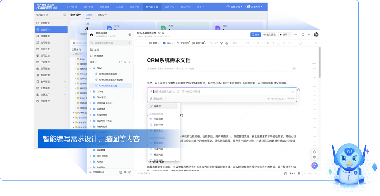 面向IT人員的低代碼智能應(yīng)用,幫助編寫需求文檔、設(shè)計(jì)文檔,減輕技術(shù)人員寫文檔的壓力。