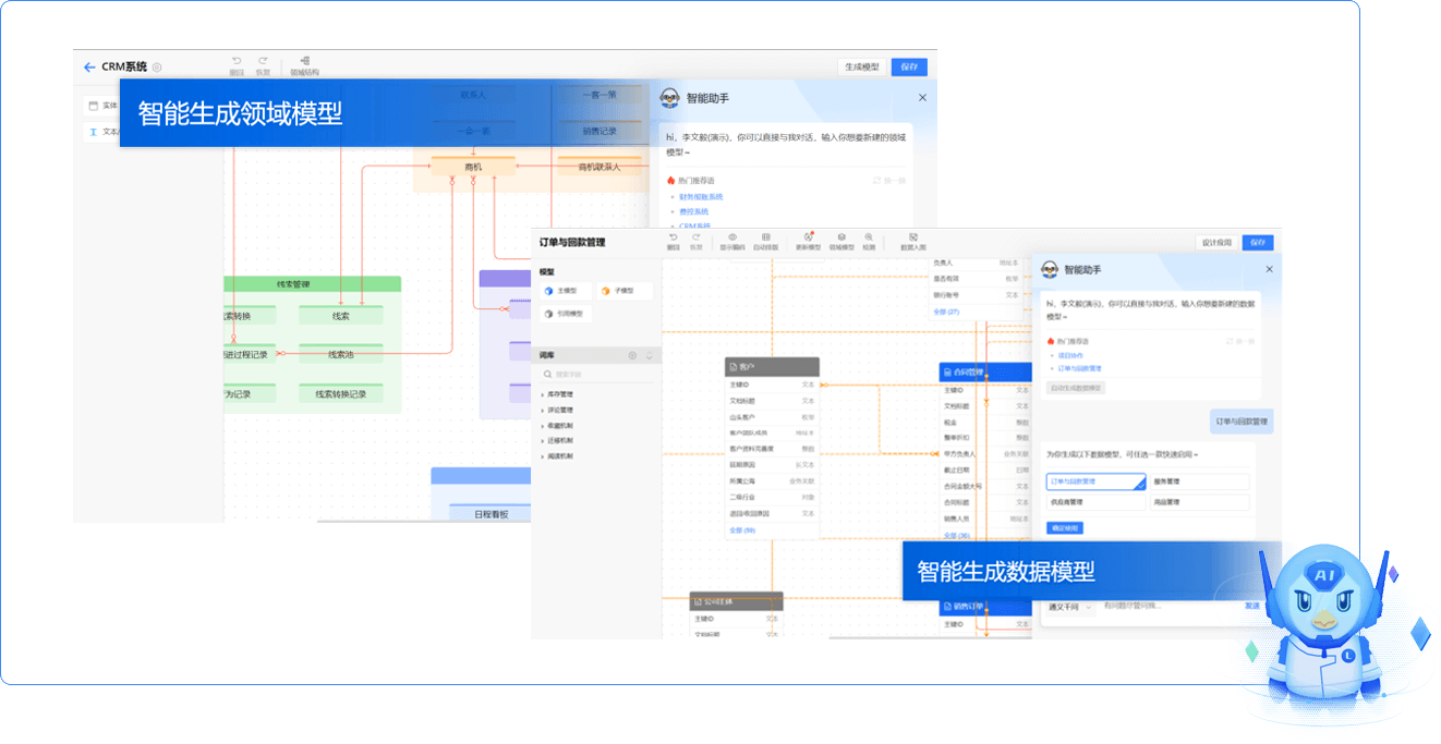 根據(jù)設(shè)計(jì)文檔智能生成應(yīng)用的領(lǐng)域模型,再根據(jù)領(lǐng)域模型智能生成數(shù)據(jù)模型,以此為基礎(chǔ),大幅度減少設(shè)計(jì)工作。