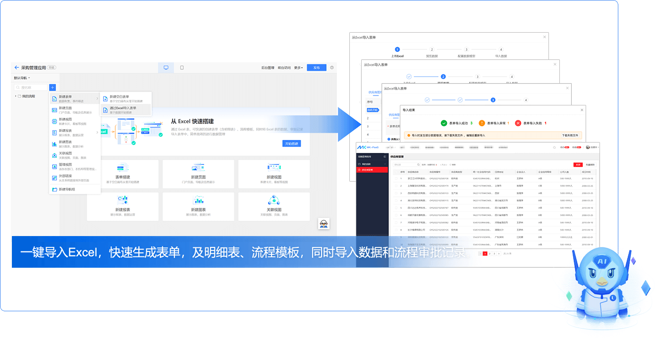 平臺(tái)將業(yè)務(wù)人員的業(yè)務(wù)梳理Excel文檔,自動(dòng)生成數(shù)據(jù)模型和整個(gè)應(yīng)用,快速滿足業(yè)務(wù)部門的業(yè)務(wù)需求。