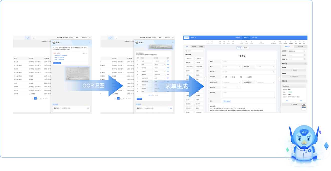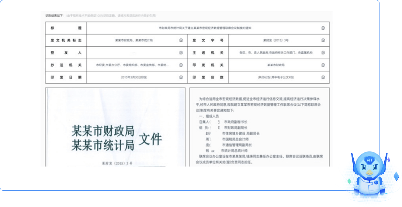 通過(guò)OCR識(shí)圖及算法糾偏,實(shí)現(xiàn)對(duì)紙質(zhì)、電子表格等快速轉(zhuǎn)換為審批表單,降低人工工作量,提升業(yè)務(wù)系統(tǒng)設(shè)計(jì)效率。