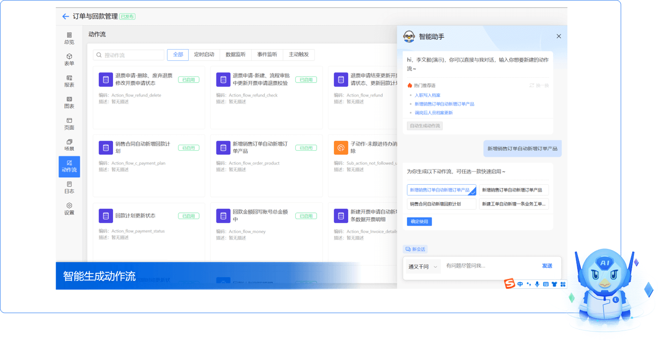 基于智能助手,可以快速對(duì)業(yè)務(wù)動(dòng)作進(jìn)行編排,簡(jiǎn)單高效,智能生成動(dòng)作流,完成特定業(yè)務(wù)處理。