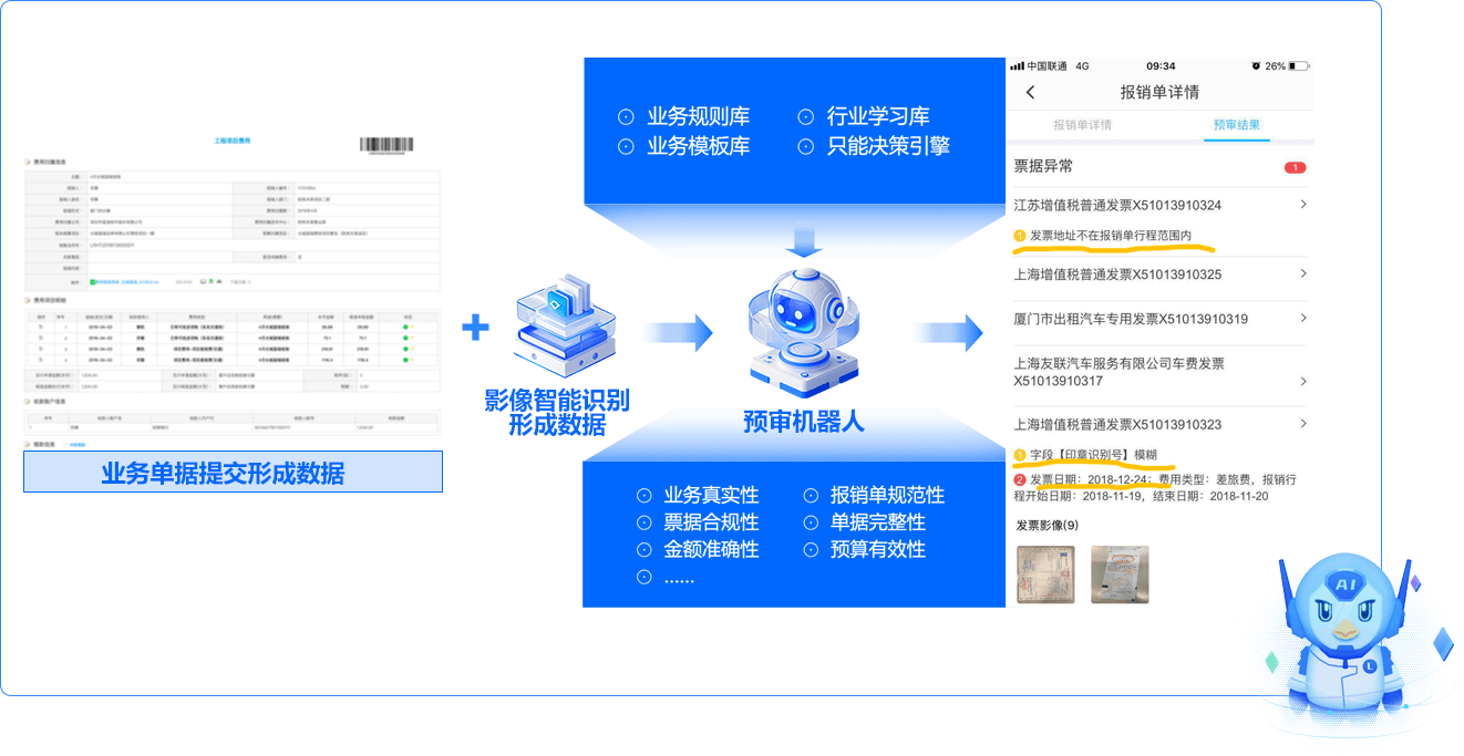 基于管理的多個(gè)維度,如業(yè)務(wù)真實(shí)性、票據(jù)合規(guī)性、單據(jù)完整性等,通過(guò)AI機(jī)器人提前預(yù)審,減少返工、提升效率。