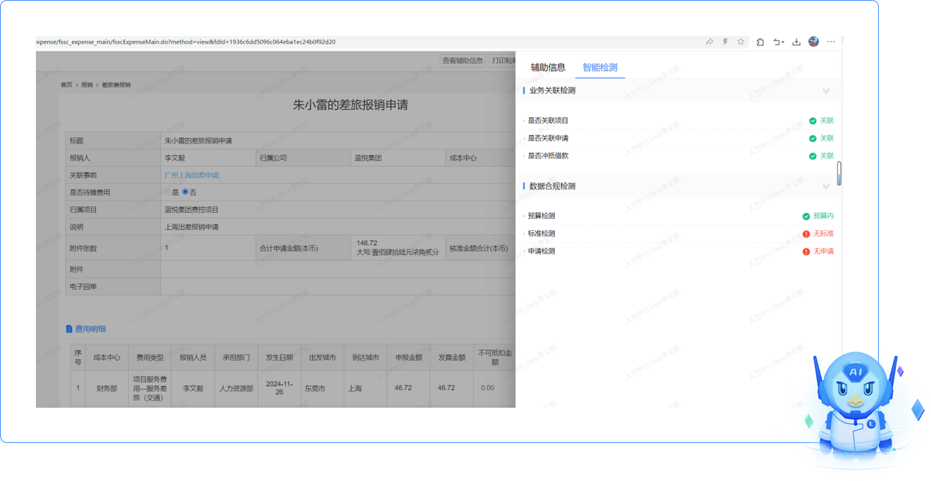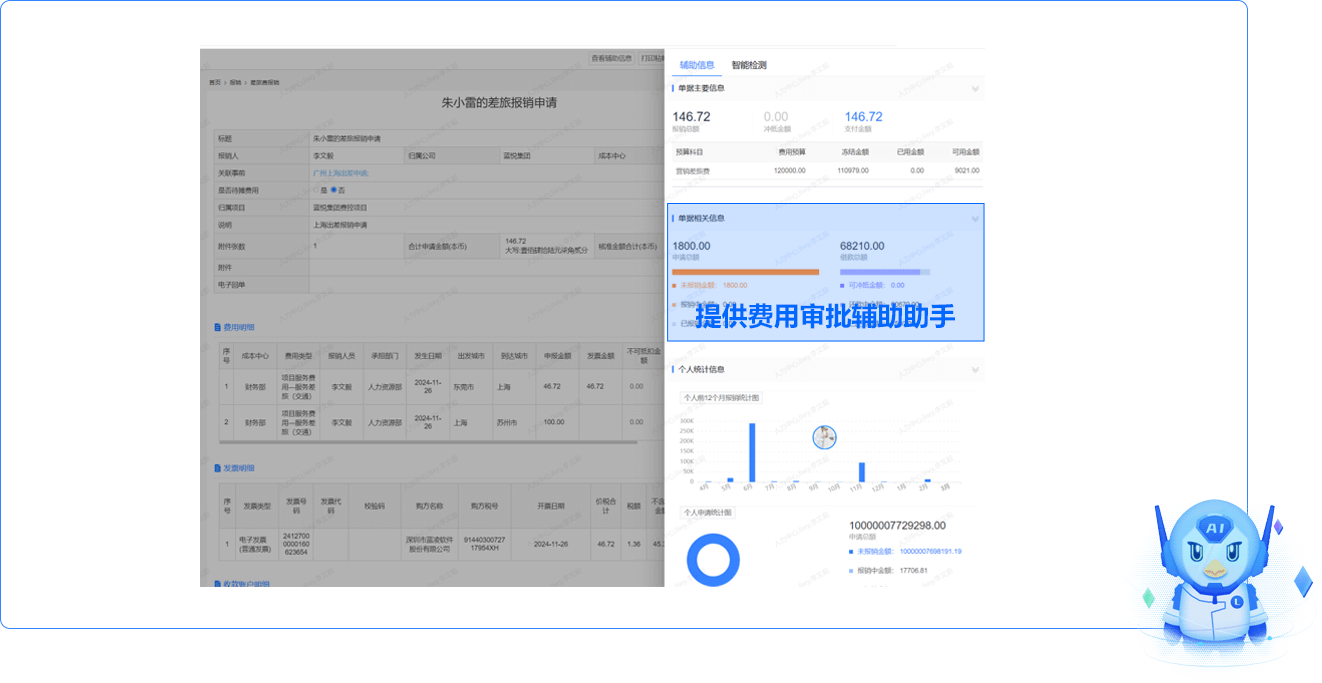 提供費(fèi)用審批輔助助手,提供對(duì)應(yīng)的預(yù)算信息、費(fèi)用標(biāo)準(zhǔn)、歷史報(bào)銷情況、單據(jù)相關(guān)的前置申請(qǐng)、借款情況統(tǒng)計(jì)分析,便于快速審核