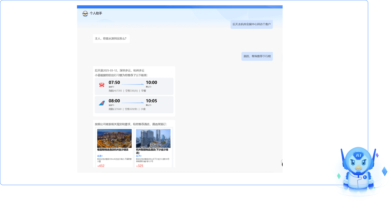 AI擬人化理解自然語(yǔ)言,分析意圖,定位所在地,獲取地域天氣(接口對(duì)接取天氣信息),分析出行人的偏好,結(jié)合天氣信息和偏好推薦合理行程和交通工具,一系列復(fù)雜的人工場(chǎng)景,全部智能化,提交工作效率。