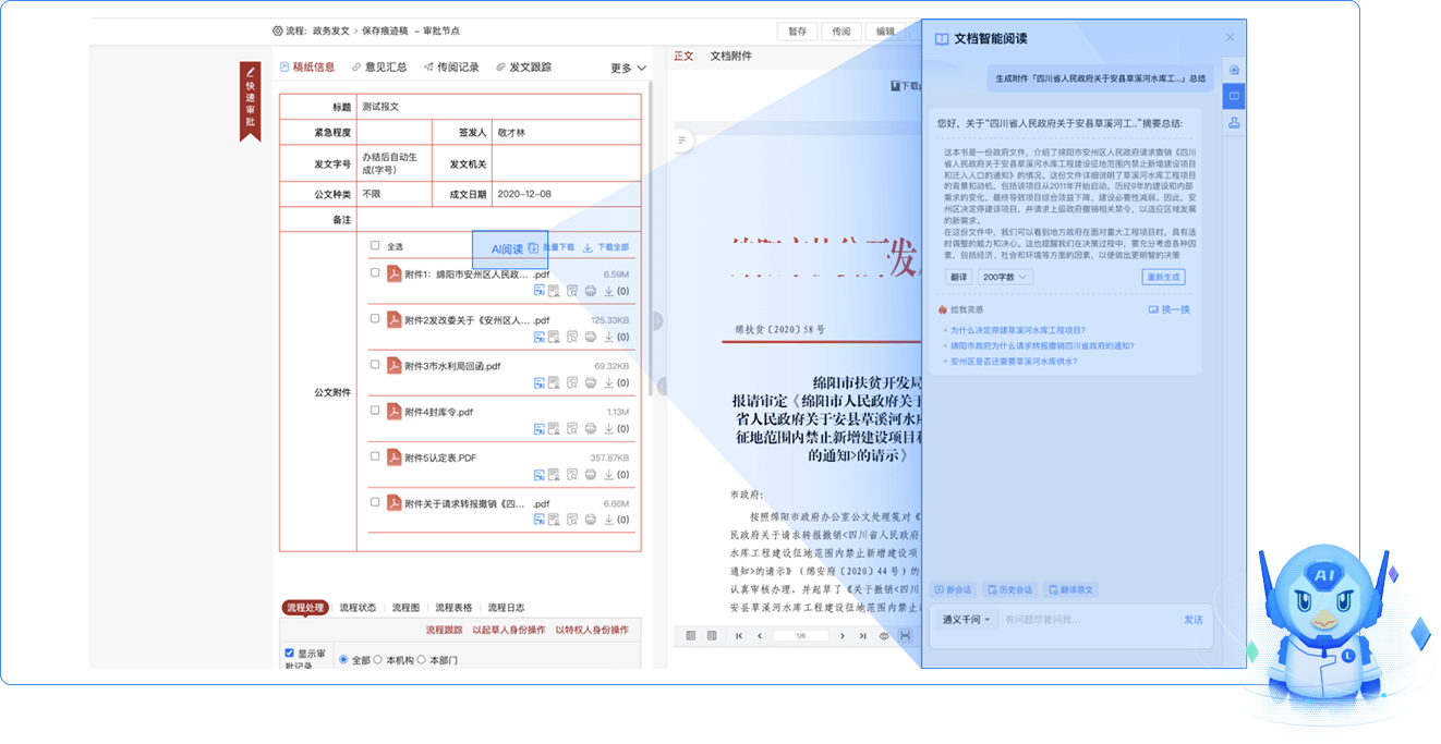可通過(guò)提取公文要素,輔助審批人快速了解公文內(nèi)容,分析公文關(guān)鍵要素;審批時(shí)自動(dòng)展示同類公文,輔助決策者參考?xì)v史處理邏輯,減少重復(fù)溝通;同時(shí)支持對(duì)公文內(nèi)容進(jìn)行連續(xù)追問(wèn),深度挖掘公文內(nèi)容,進(jìn)而提升共享審核人員的作業(yè)效率,輔助人工審核,提高審核質(zhì)量、降低人力成本。