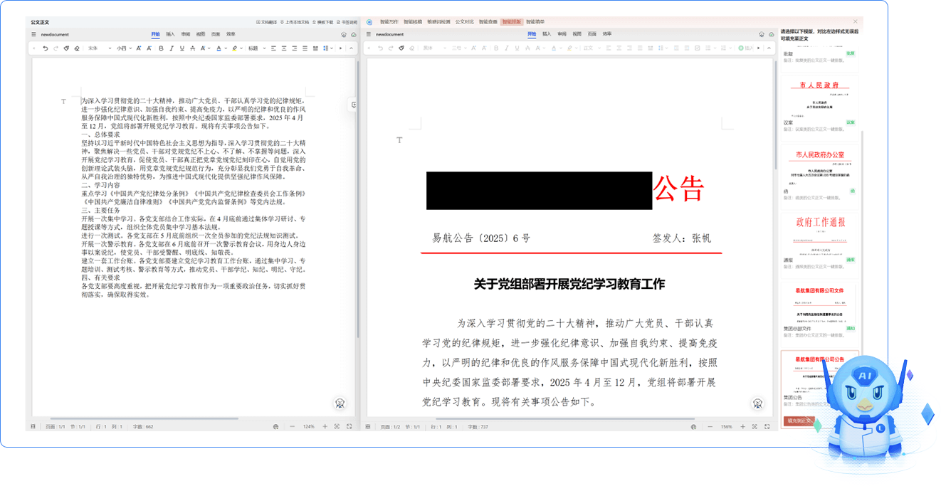 支持 15 種國(guó)標(biāo)公文寫作,涵蓋 “全文 / 提綱” 編寫及 “續(xù)寫、擴(kuò)寫、改寫” 等功能,智能推薦匹配范本并全自動(dòng)排版,大幅提升擬稿效率