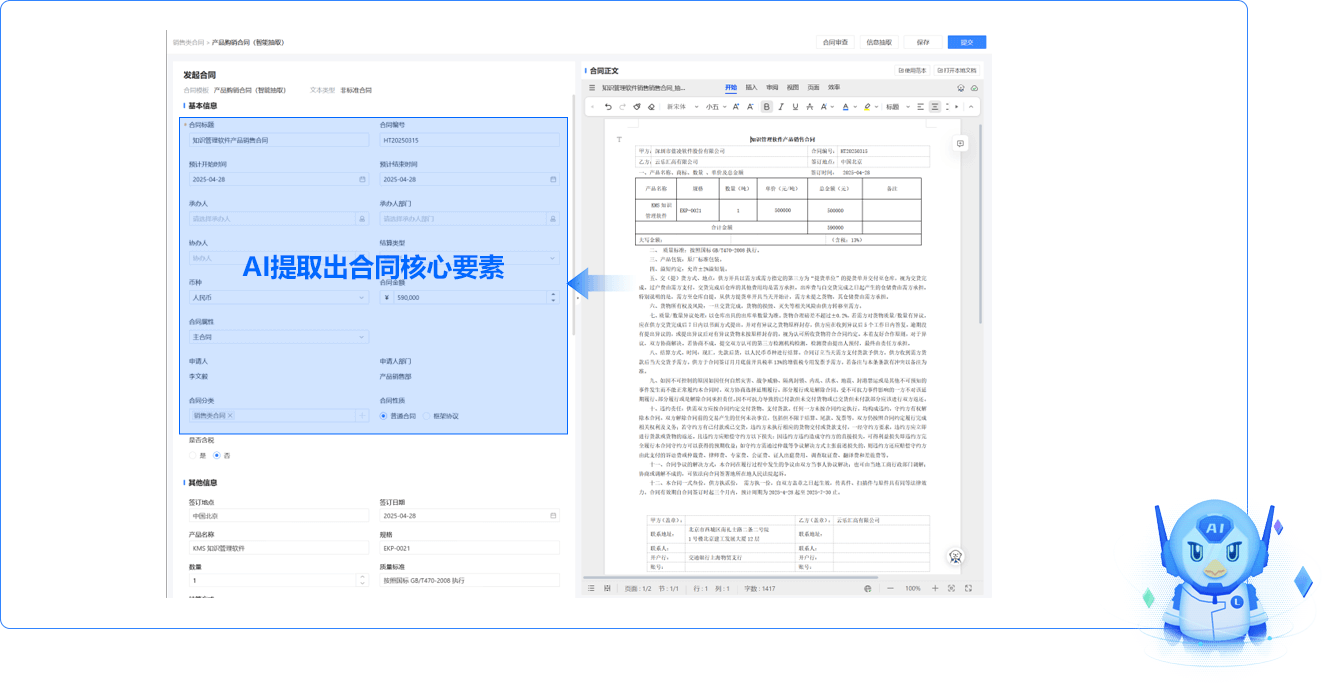 AI提取出合同核心要素,例如標(biāo)題、編號(hào)、金額、付款計(jì)劃等。并且將這部分要素填充到結(jié)構(gòu)化的表單中用于合同審批流程發(fā)起。節(jié)省用戶發(fā)起非標(biāo)合同時(shí)需要手動(dòng)錄入流程相關(guān)信息的操作。