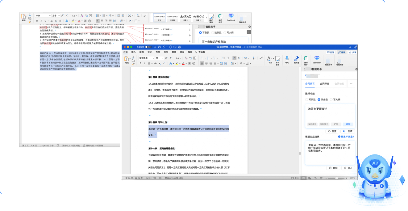 根據(jù)用戶描述的合同類型與需求生成出合適的合同示范文本。支持AI推薦合適的合同條款模板,例如保密協(xié)議、知識(shí)產(chǎn)權(quán)條款等,并提供條款解釋和適用場(chǎng)景;支持AI改寫、擴(kuò)寫等潤(rùn)色操作。簡(jiǎn)化合同起草過(guò)程,確保合同條款的合規(guī)性和適用性,提高合同質(zhì)量。