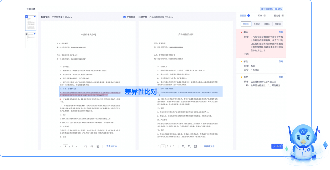 支持對(duì)兩份不同的文檔進(jìn)行差異性比對(duì),支持 docx 流式文件、版式文件、圖片/掃描件等之間的差異比較與標(biāo)識(shí)。通過(guò)系統(tǒng)自動(dòng)識(shí)別差異,可實(shí)現(xiàn)流程自動(dòng)通過(guò)等智能審批需求,提高合同審查效率,確保合同版本的一致性,避免因版本差異導(dǎo)致的誤解或錯(cuò)誤。