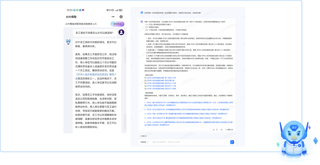 支持法律法規(guī)檢索、類案檢索、法律咨詢服務(wù)等,允許用戶對(duì)法律相關(guān)知識(shí)事務(wù)進(jìn)行提問(wèn)咨詢;通過(guò)描述相關(guān)案情信息,自動(dòng)分析案件的核心事實(shí)、法律關(guān)系、爭(zhēng)議焦點(diǎn)等生成相似案例,并給出案例之間的相似點(diǎn)和差異點(diǎn)。