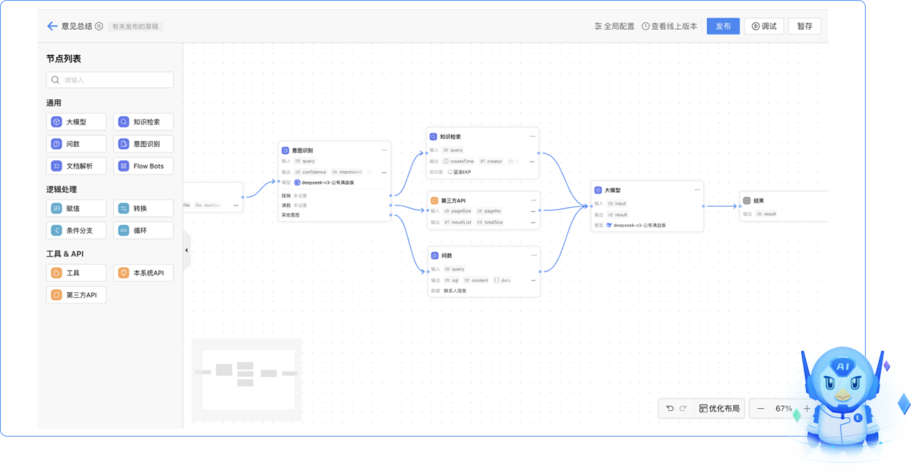 藍(lán)博士FlowBots :開(kāi)箱即用大模型/問(wèn)數(shù)/檢索節(jié)點(diǎn),與藍(lán)凌產(chǎn)品 API 無(wú)縫對(duì)接,配備外部插件工具,支持拖拉拽 Flow搭建,并實(shí)時(shí)跟蹤調(diào)試效果