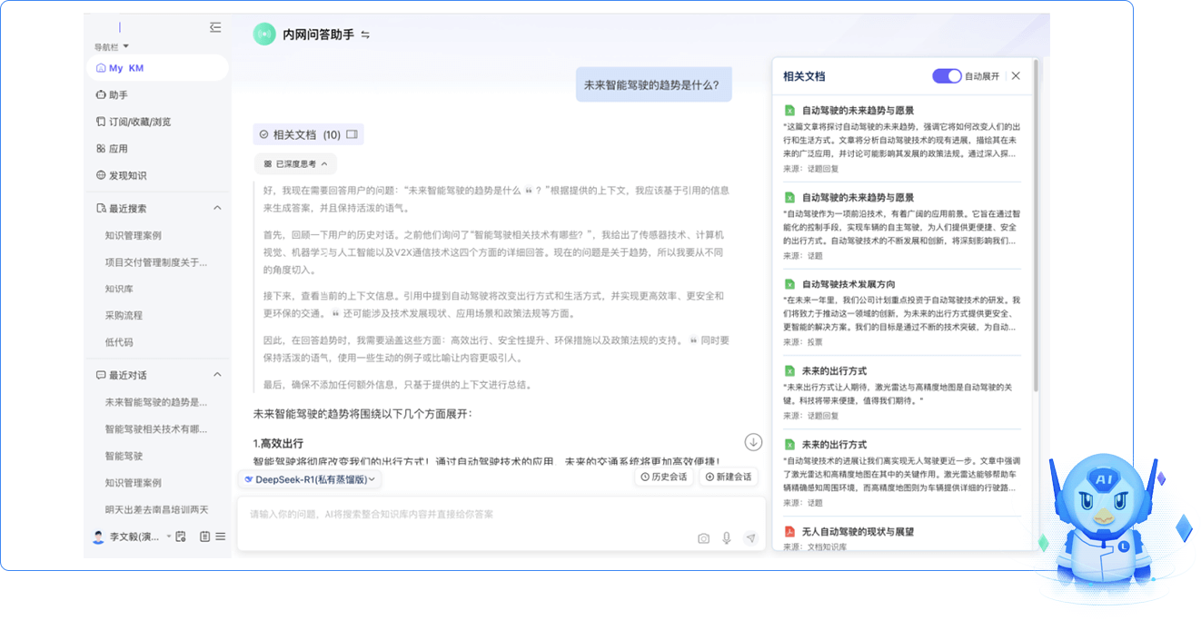 攜手藍(lán)凌對(duì)接私有大模型通義千問(wèn)+DeepSeek,上傳近萬(wàn)份知識(shí)文檔為AI應(yīng)用搭好基礎(chǔ)。全新工程技術(shù)智能知識(shí)庫(kù)系統(tǒng),實(shí)現(xiàn)了智能搜索、智能問(wèn)答、智能助手等系列功能,構(gòu)建了企業(yè)知識(shí)中樞,為一線施工人員、管理人員等提供個(gè)性化知識(shí)服務(wù)