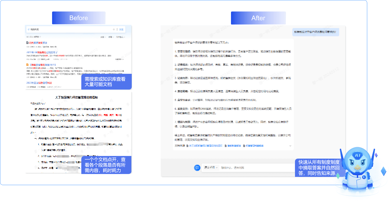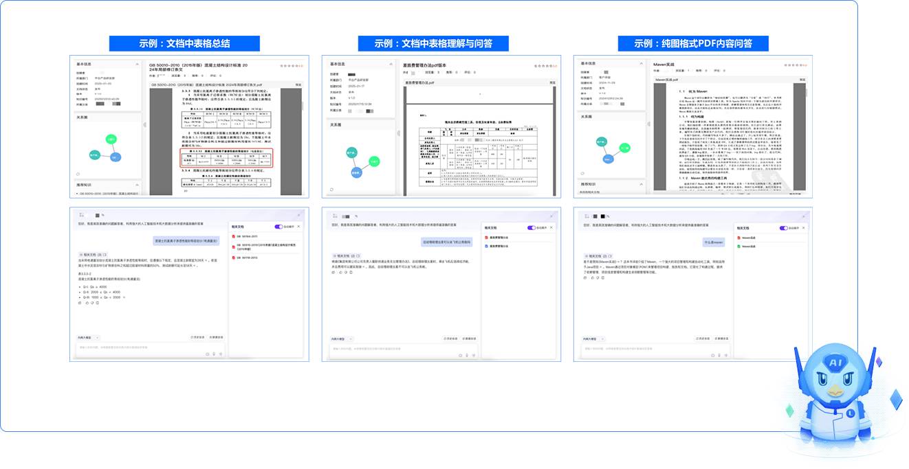 支持將不同格式文檔“投喂”AI,如WORD、PDF、表格等格式,通過(guò)AI的總結(jié)、理解與問(wèn)答,可以快速生成AI問(wèn)答服務(wù),在企業(yè)內(nèi)部提供各種專業(yè)領(lǐng)域的員工自助問(wèn)答助手,提升知識(shí)傳遞效率。