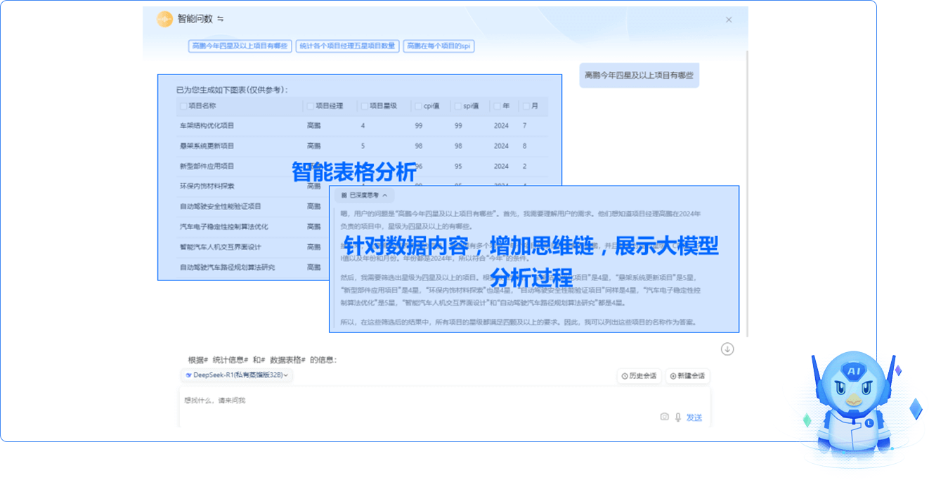 智能問(wèn)數(shù):智能問(wèn)數(shù)機(jī)器人可以幫助企業(yè)員工快速獲取業(yè)務(wù)數(shù)據(jù),支持多維度分析和復(fù)雜查詢,提升決策效率,若使用R1版本的DeepSeek模型,則可查看問(wèn)數(shù)分析的推理過(guò)程