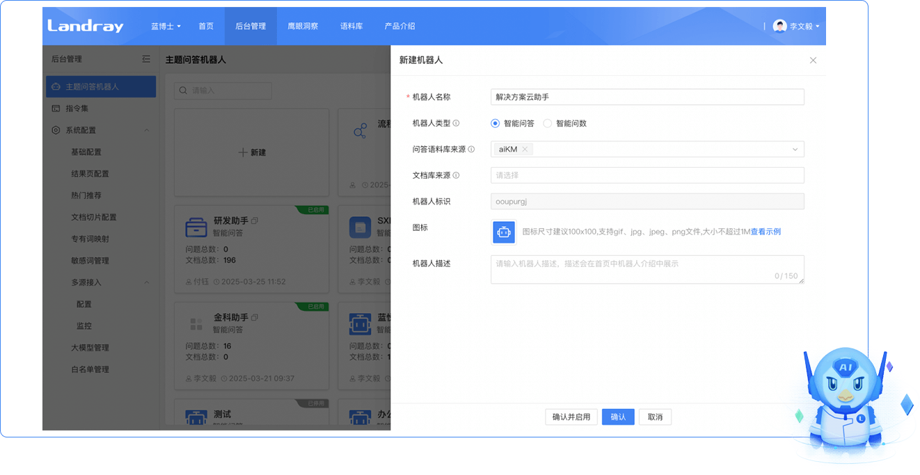 藍(lán)博士RAG:具備主題知識(shí)庫(kù)與數(shù)據(jù)集聯(lián)動(dòng)能力;支持全局/單庫(kù)語(yǔ)義切片、窗口 + 大模型切片,提供切片可視化與重編輯功能;支持卡片式交互及多模態(tài)識(shí)別