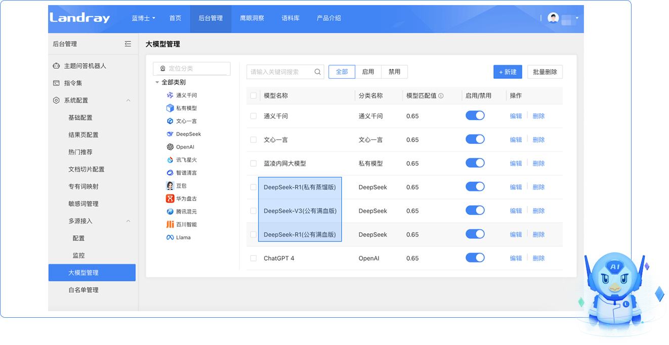 支持接入主流的公有/私有大模型,包括DeepSeek、通義千問(wèn)、文心一言等大模型,以及企業(yè)自身研發(fā)的模型。其中,對(duì)接的DeepSeek大模型,支持V3(公有滿血版)、R1(公有滿血版)、R1(私有蒸餾版等),滿足企業(yè)不同層次的需求。