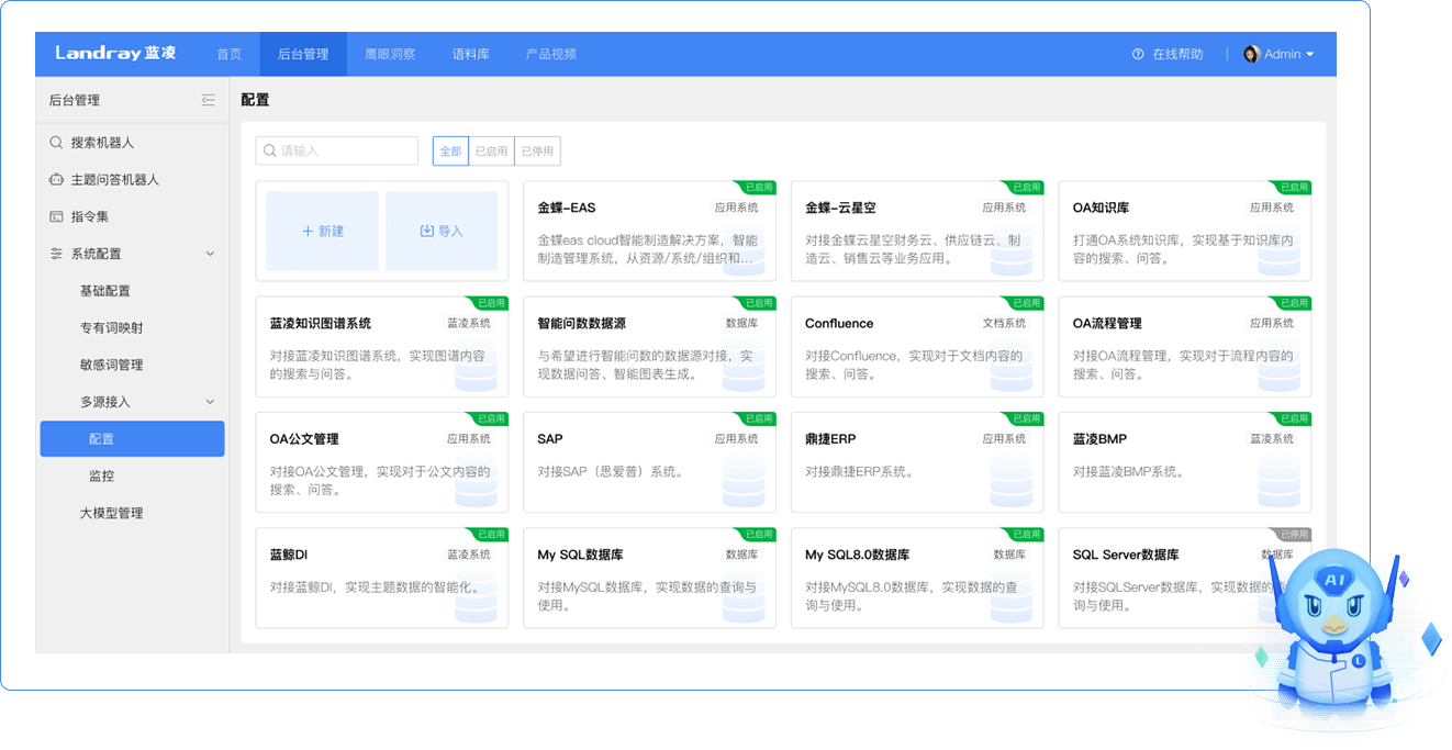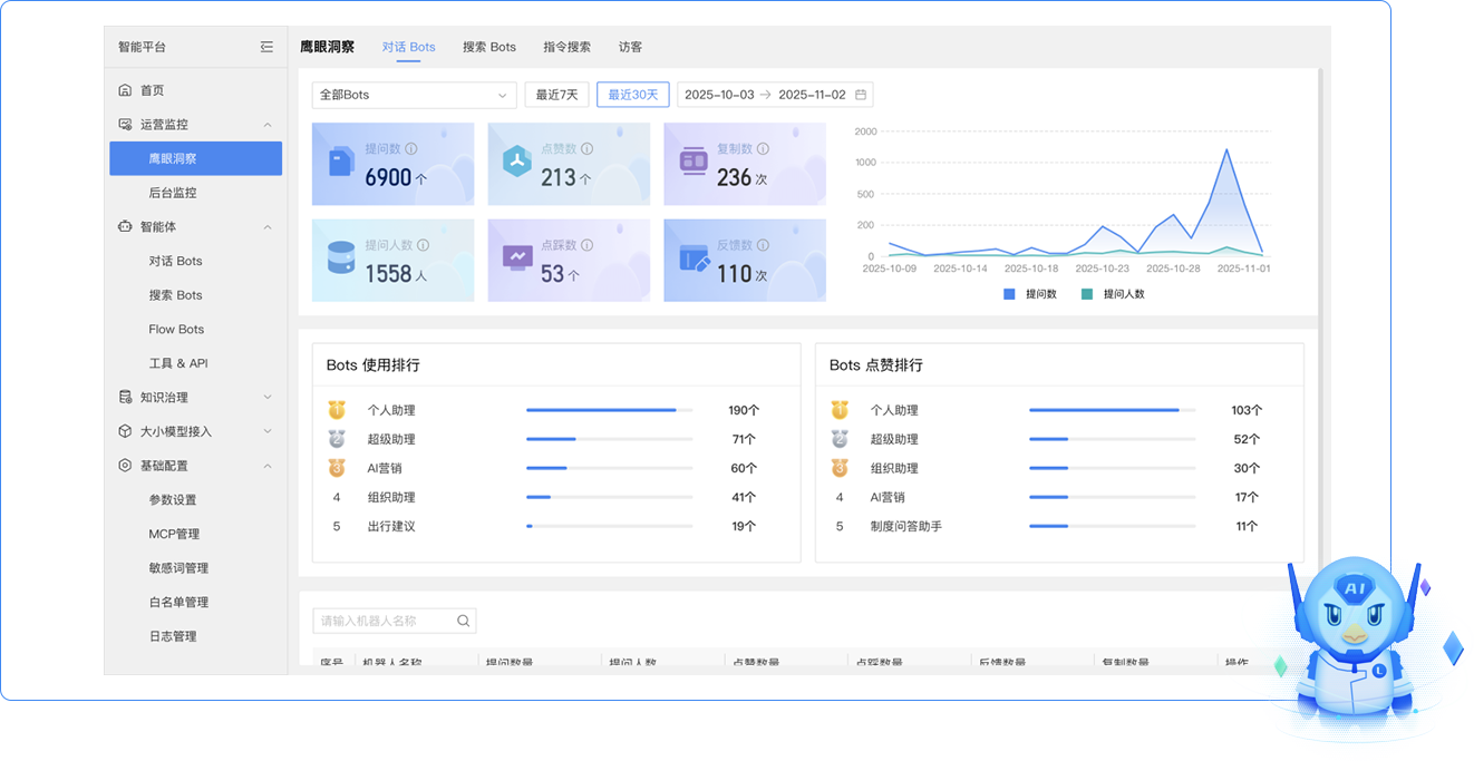 藍(lán)博士ChatBots:具備專屬數(shù)據(jù)語(yǔ)料、模型工作規(guī)劃、工具&插件調(diào)用能力;支持多輪對(duì)話交互與不同場(chǎng)景植入;可實(shí)現(xiàn)知識(shí)數(shù)據(jù)聯(lián)動(dòng)及接口自動(dòng)讀寫