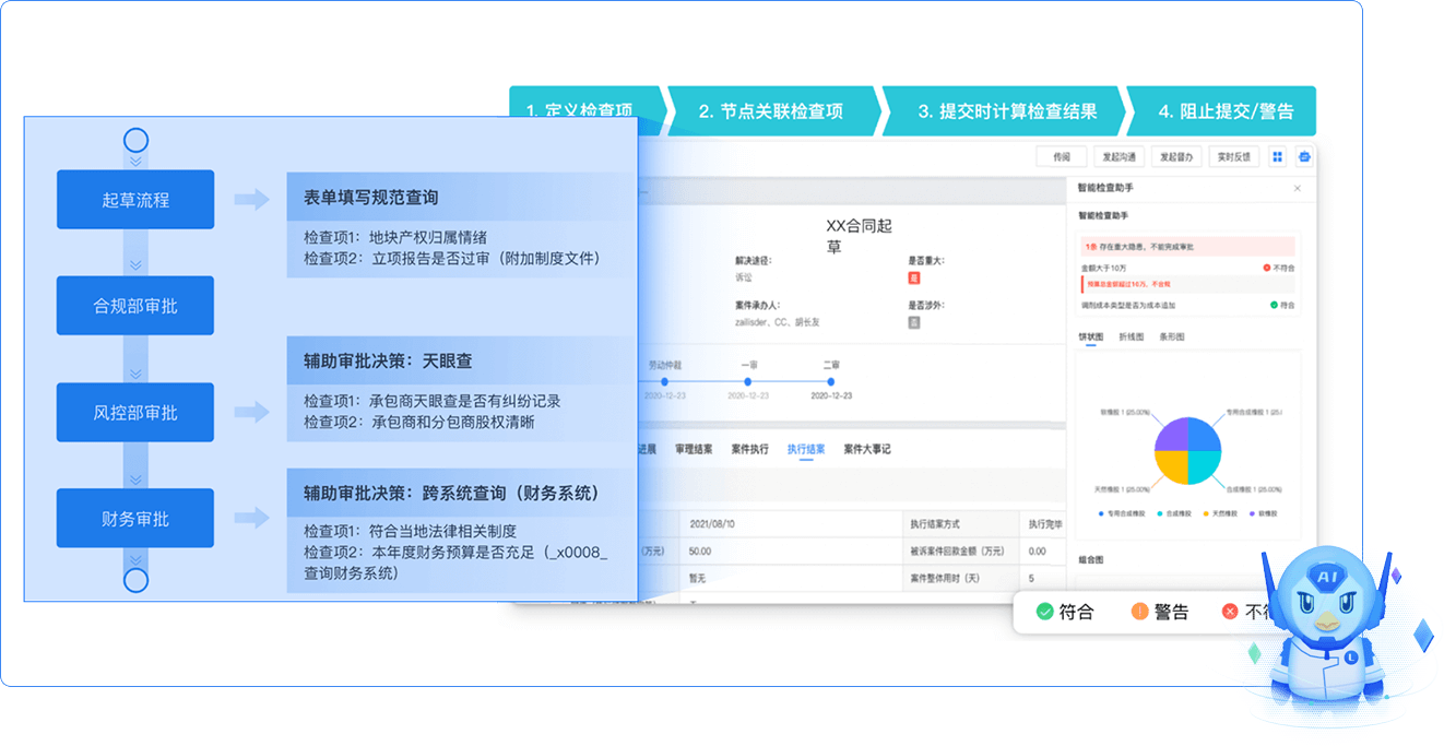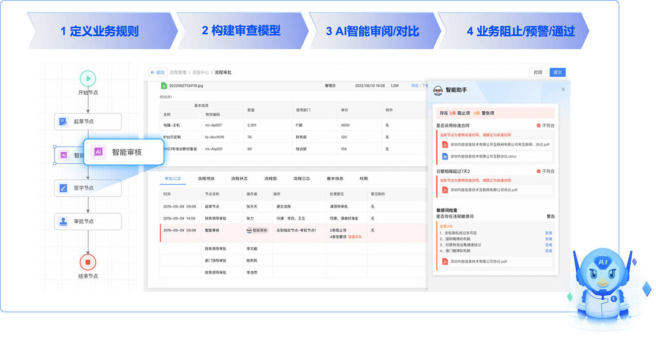 對(duì)于業(yè)務(wù)過(guò)程中的具體管控維度,比如預(yù)算是否超標(biāo)、是否符合標(biāo)準(zhǔn)等,AI可以快速進(jìn)行合規(guī)性掃瞄。
