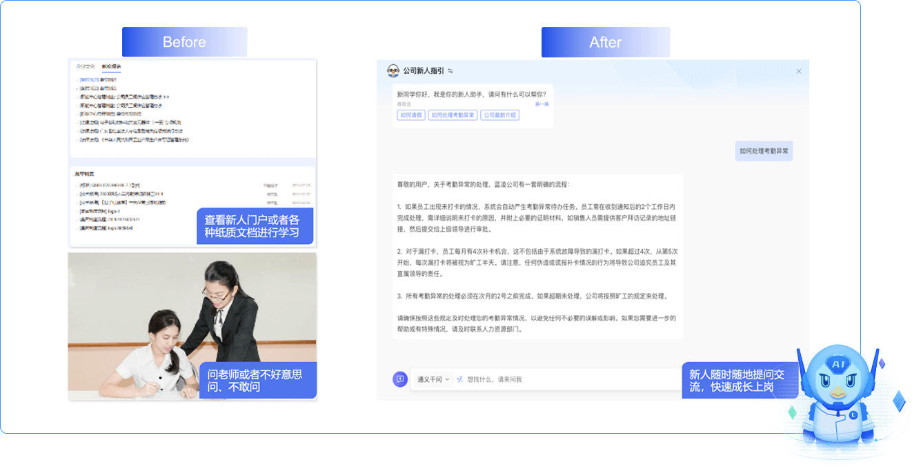 將企業(yè)新人所需的指引、制度、工作標(biāo)準(zhǔn)等知識(shí)接入AI,實(shí)現(xiàn)新員工的自助服務(wù),幫助新員工更快適應(yīng)環(huán)境,快速成長(zhǎng)。