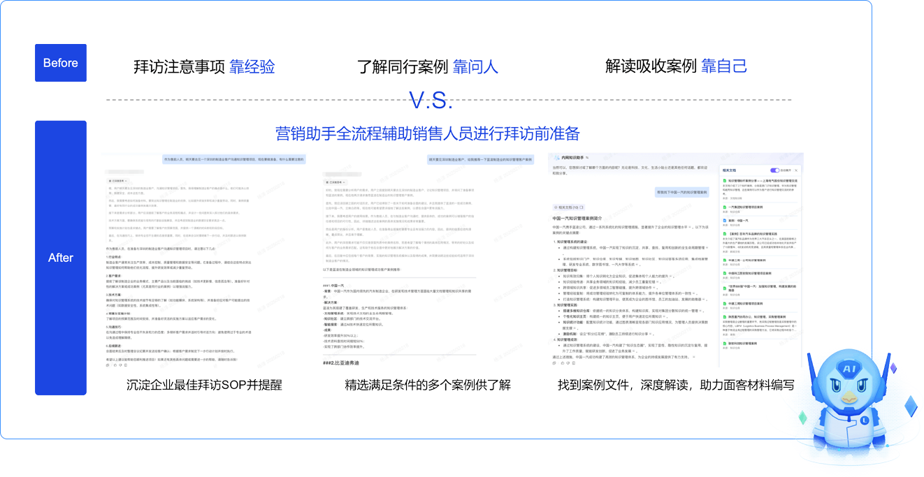 在銷售過(guò)程中的每個(gè)關(guān)鍵環(huán)節(jié),AI結(jié)合具體項(xiàng)目類型進(jìn)行案例和指引內(nèi)容的精準(zhǔn)推送,輔助進(jìn)行面客材料的快速編寫。