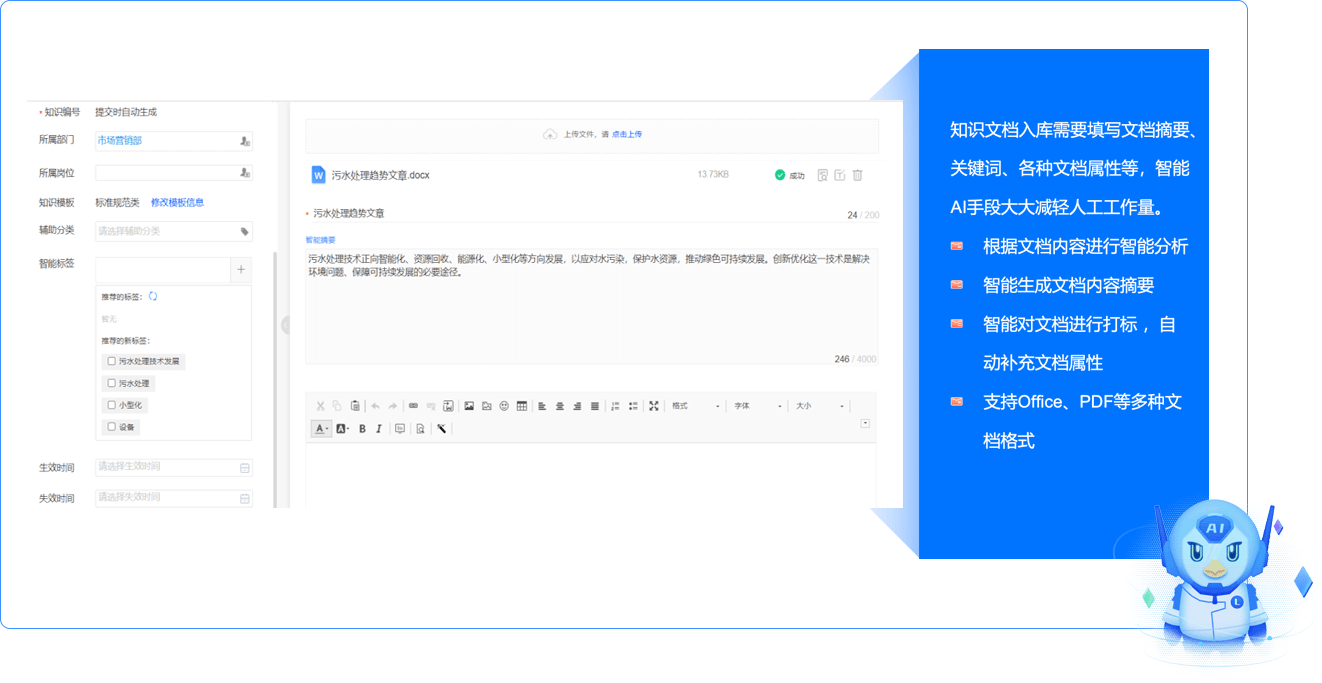 通過(guò)AI對(duì)文檔內(nèi)容自動(dòng)進(jìn)行摘要生成、標(biāo)簽屬性分類等,幫助企業(yè)快速建立和盤活存量知識(shí),構(gòu)建知識(shí)資產(chǎn)庫(kù)。
