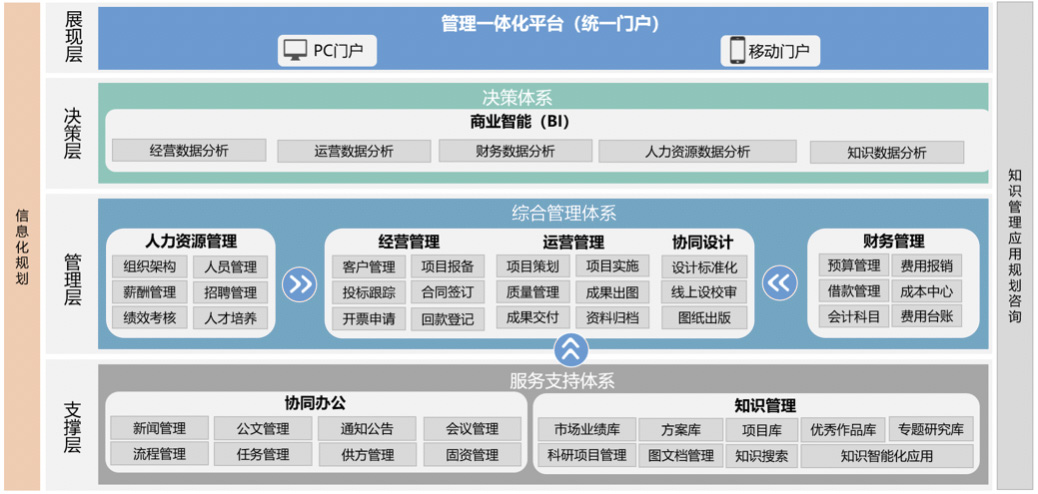 簡(jiǎn)介: 從決策、業(yè)務(wù)、管理、知識(shí)四個(gè)維度,支撐勘察設(shè)計(jì)企業(yè)提升綜合管控能力、提效市場(chǎng)經(jīng)營(yíng)與項(xiàng)目運(yùn)營(yíng)管理;讓知識(shí)驅(qū)動(dòng)科技創(chuàng)新,賦能復(fù)合型人才培養(yǎng),打造技術(shù)領(lǐng)先的智慧設(shè)計(jì)院。