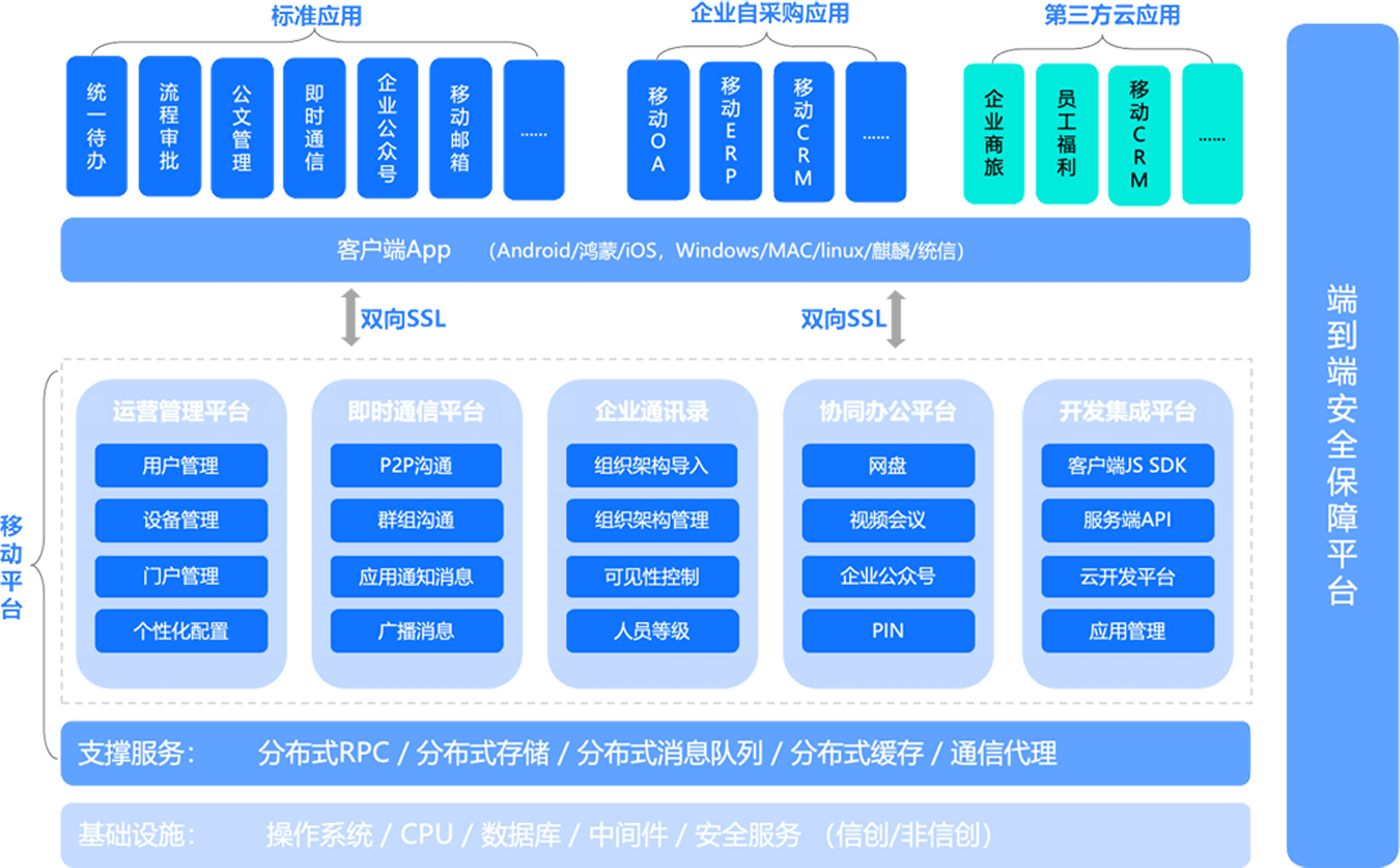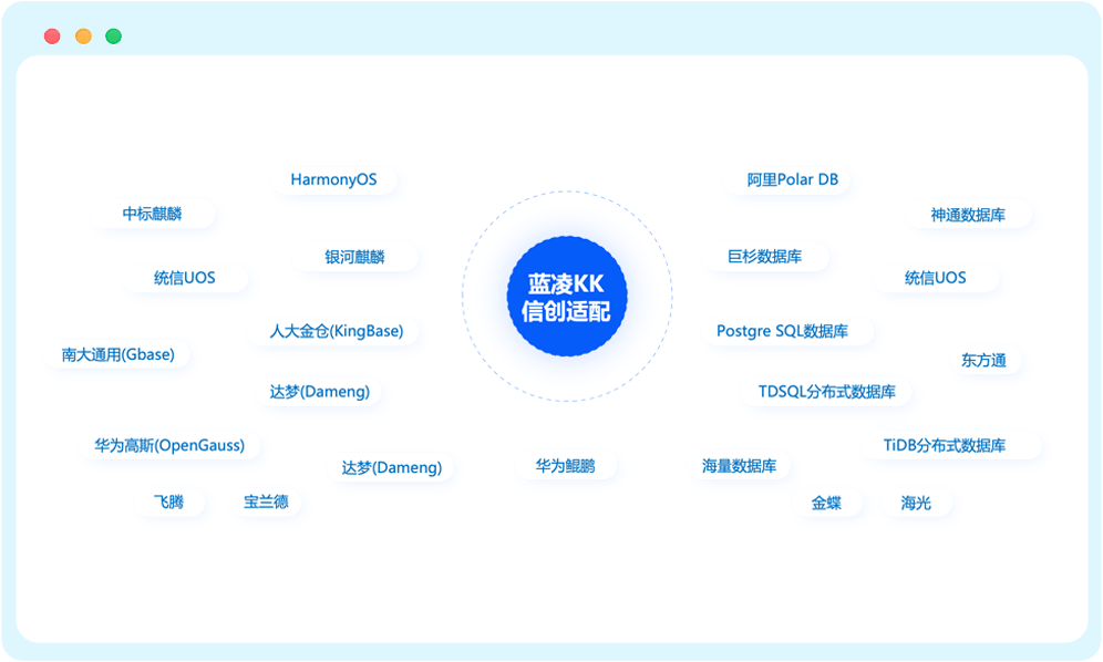藍凌KK支持在主流國產操作系統(tǒng)(中標麒麟、銀河麒麟、統(tǒng)信UOS、HarmonyOS…)、國產CPU、國產數(shù)據(jù)庫等上面運行,打造更安全高效信創(chuàng)辦公。