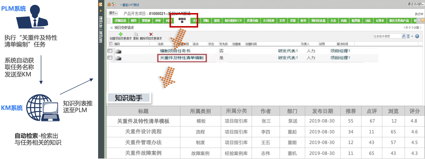 當研發(fā)人員在研發(fā)業(yè)務(wù)系統(tǒng)中執(zhí)行任務(wù)時,知識管理系統(tǒng)可自動識別任務(wù)關(guān)鍵字,根據(jù)關(guān)鍵字自動搜索整理相關(guān)知識,推送知識至研發(fā)業(yè)務(wù)系統(tǒng)供研發(fā)人員查閱參考。