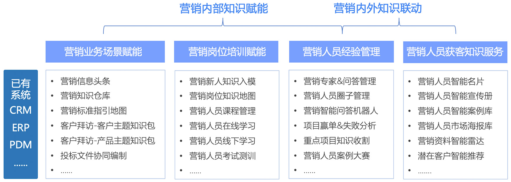 通過構(gòu)建標準化營銷知識體系、梳理基于SOP的知識專題、構(gòu)建營銷門戶與營銷地圖、打造知識社區(qū)等,幫助營銷人員快速提升業(yè)務(wù)能力;并可為營銷人員量身定制電子化“營銷公文包”,助力獲客。
