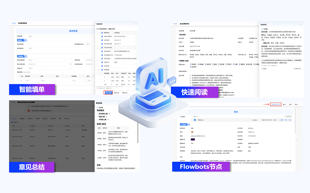 AI助力低代碼搭建多場景,開啟企業(yè)級(jí)數(shù)字化的“自動(dòng)駕駛”模式。智能設(shè)計(jì):AI 在線梳理管理需求,對(duì)齊業(yè)務(wù)目標(biāo),彌合需求與 IT 實(shí)現(xiàn)的鴻溝。智能搭建:對(duì)話式交互輔助,秒級(jí)完成數(shù)字化應(yīng)用設(shè)計(jì)搭建。智能優(yōu)化場景:支持字段、字體、大小調(diào)整及主題換膚。智能填單:自動(dòng)化提取填充附件信息,提升填單效率,加速業(yè)務(wù)流轉(zhuǎn)。智能寫作:快速生成富文本框架與初稿,輔助內(nèi)容擴(kuò)展,提效保質(zhì)降門檻??焖匍喿x:精準(zhǔn)提煉關(guān)鍵信息,提升閱讀效率與信息轉(zhuǎn)化能力。