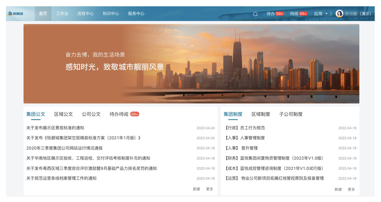 經(jīng)過持續(xù)建設與推廣,集團門戶已實現(xiàn)多業(yè)態(tài)推廣全覆蓋,包括集團總部、地產(chǎn)、物業(yè)、印力、美好家、嘉興事業(yè)部等,日均用戶訪問量超10萬次,助力審批省時10%。