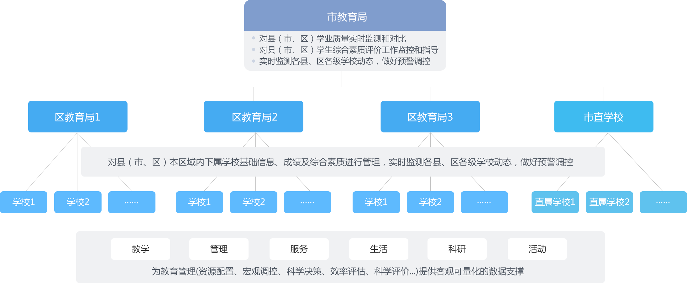 通過三期項目建設,構建了貫通幼兒園到教育局的統(tǒng)一信息化管理平臺,實現(xiàn)了區(qū)域內(nèi)學生數(shù)據(jù)縱向貫穿以及學校數(shù)據(jù)橫向貫穿,形成長期數(shù)據(jù)沉淀,鹽田教研中心已成為深圳首家、全國領先的智慧教科研中心