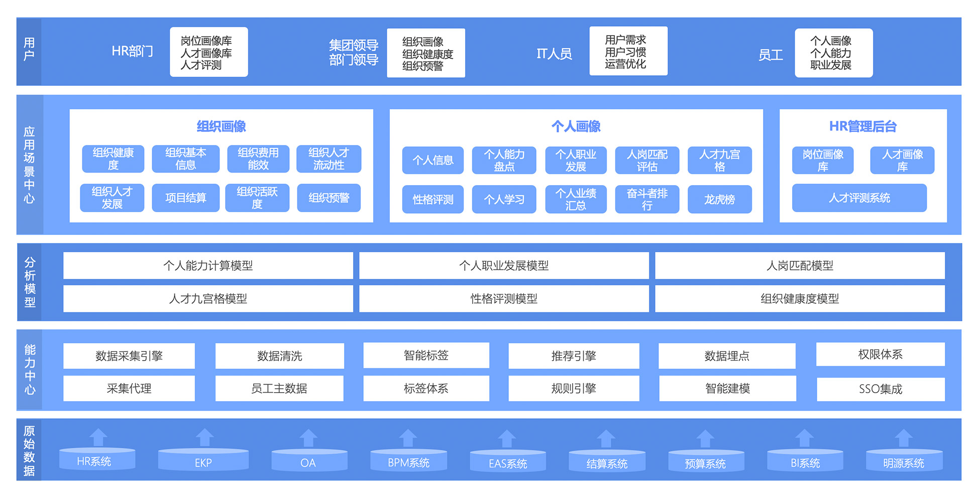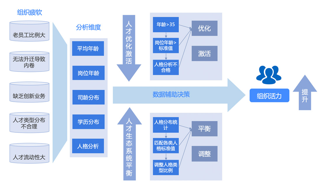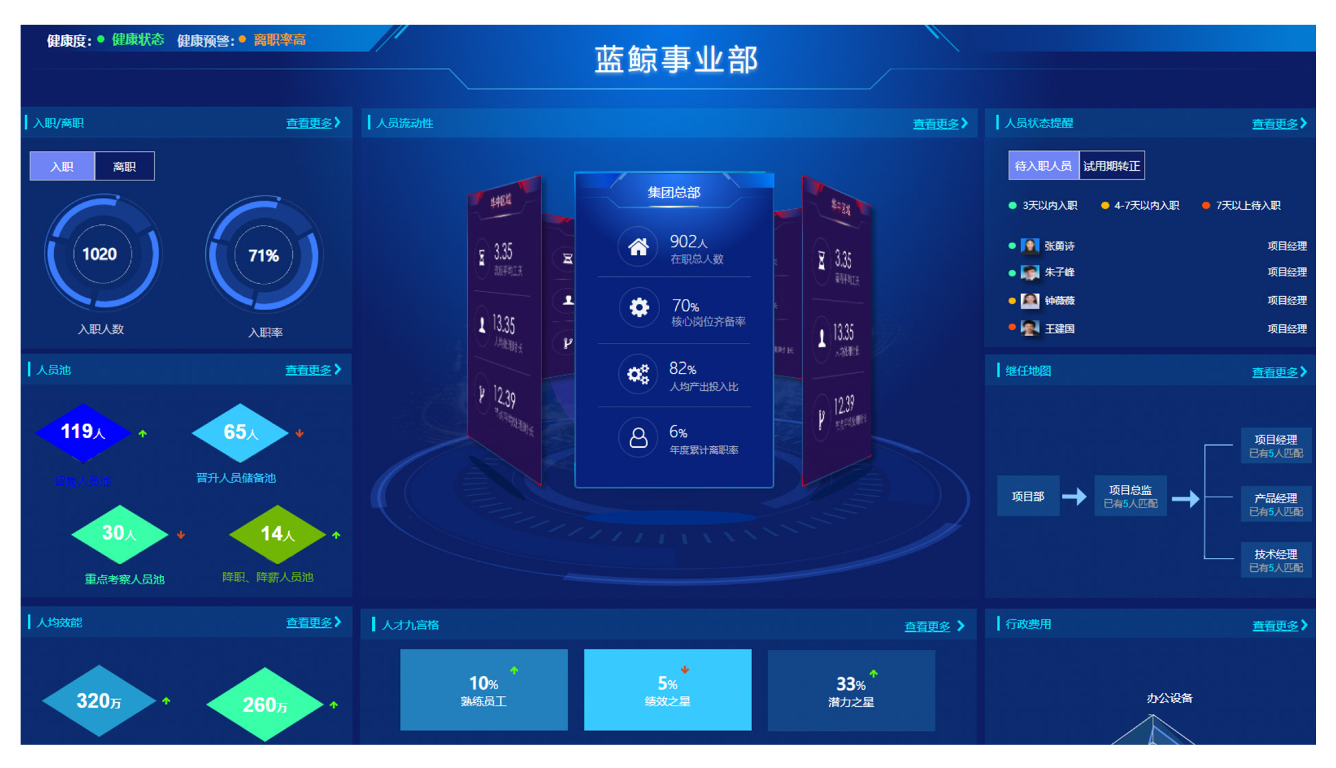 將人才關(guān)鍵指標(biāo)數(shù)據(jù)入庫,搭建組織數(shù)字化基礎(chǔ)設(shè)施,構(gòu)建組織健康度模型,實(shí)現(xiàn)組織健康度診斷,便于及時(shí)發(fā)現(xiàn)組織存在的問題、調(diào)整人才戰(zhàn)略