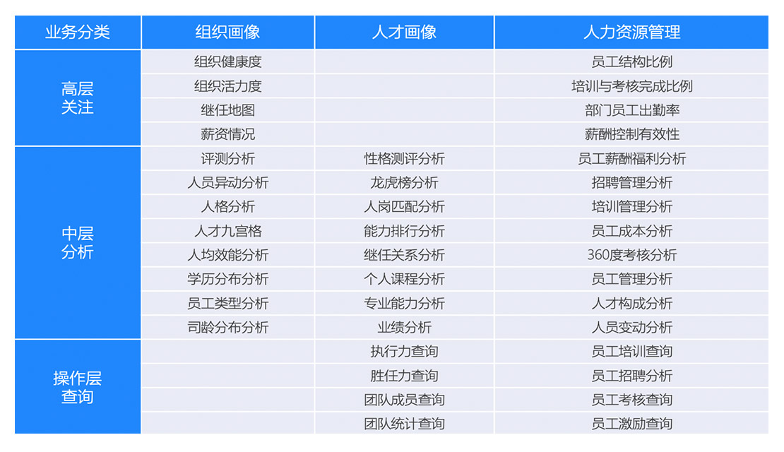 個(gè)人能力盤點(diǎn)、人才測(cè)評(píng)等為員工加薪、職業(yè)發(fā)展提供最基本的參考指標(biāo);人才九宮格、人崗匹配為關(guān)鍵崗位提供繼任者地圖,避免關(guān)鍵崗位流失對(duì)組織產(chǎn)生致命影響
