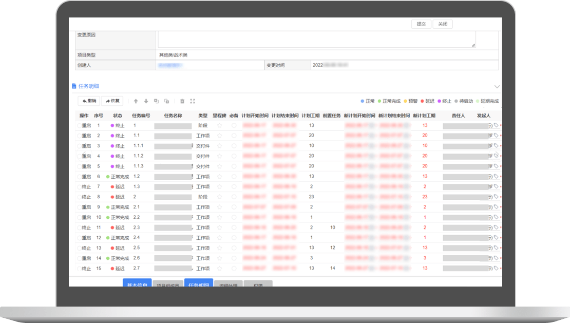 支持項(xiàng)目啟動、運(yùn)行階段進(jìn)行多種類型的項(xiàng)目變更,提供變更前、后的對比,方便審批人決策。支持變更任務(wù)明細(xì),可對已終止或已完成的任務(wù)進(jìn)行重啟,更靈活方便