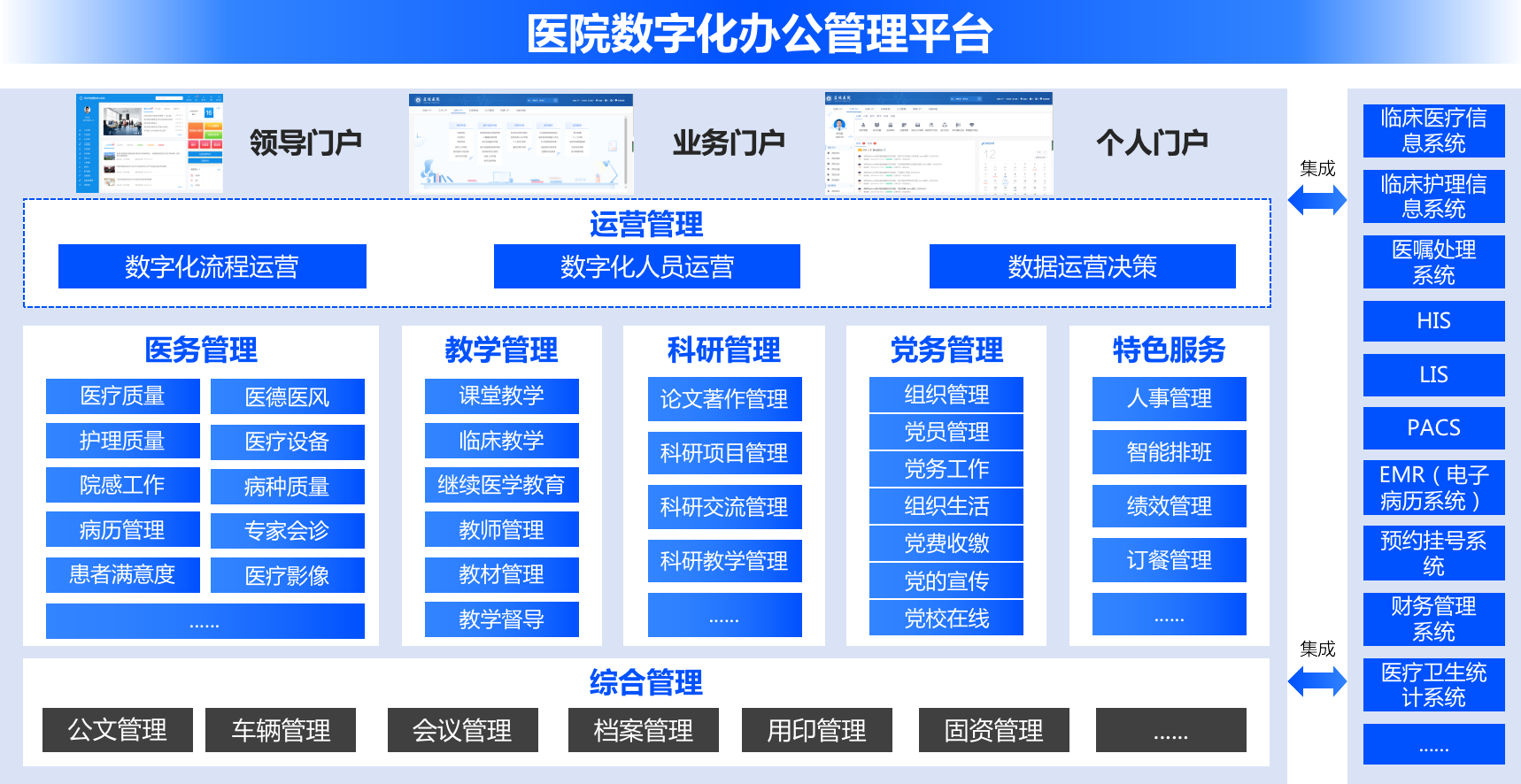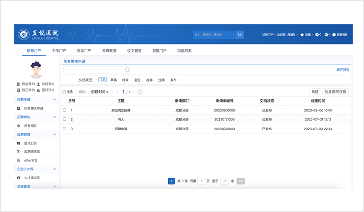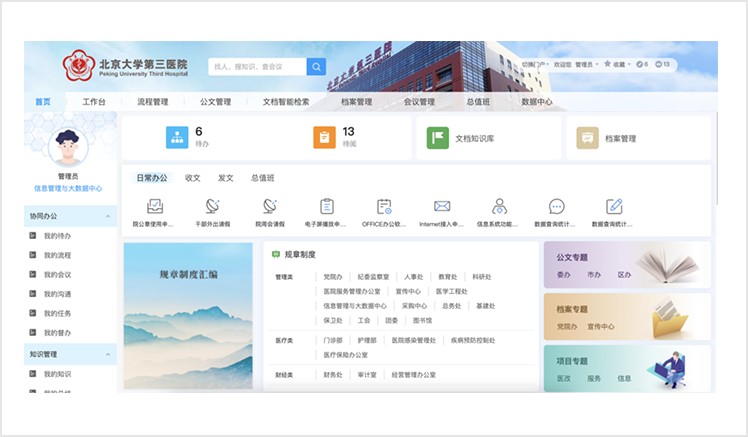 ·醫(yī)院管理標準化:以醫(yī)務管理、教學管理、科研管理、黨務服務為重點,以公文管理、車輛管理、會議管理、文檔管理為輔助,打造醫(yī)院辦公標準化管理平臺。