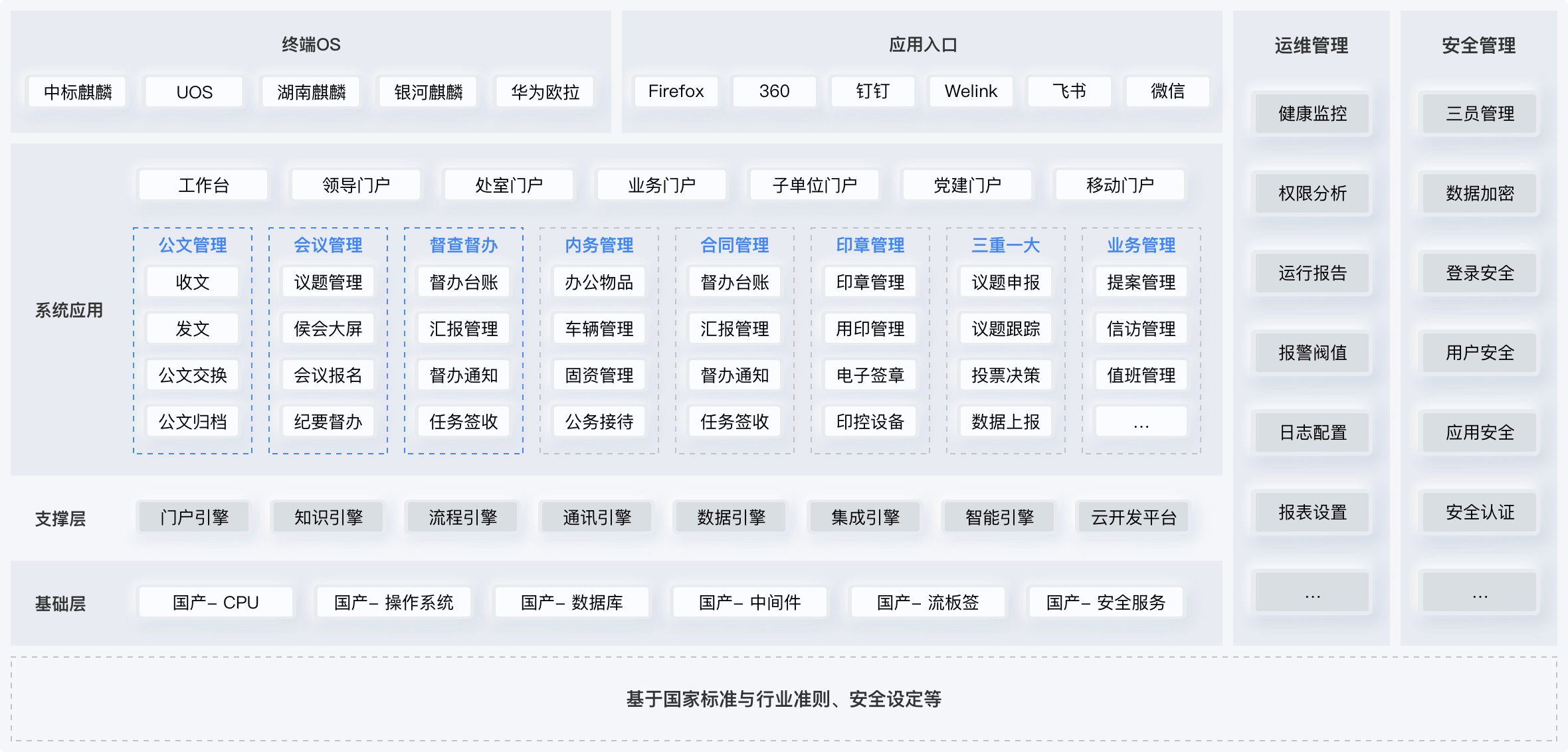 貫徹政務(wù)辦公“國(guó)產(chǎn)化”需求,搭建高標(biāo)準(zhǔn)辦公系統(tǒng),兼容XP、國(guó)密、國(guó)產(chǎn)操作系統(tǒng)與數(shù)據(jù)庫(kù),保障運(yùn)行安全可控